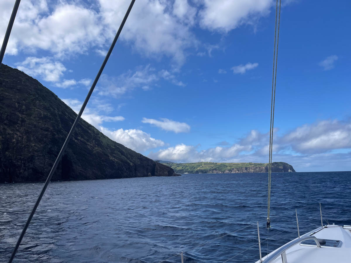 Mercredi 23 juillet Magali va au marché le matin pour l’approvisionnement des fruits et légumes. Au marché couvert il n’y a que 2 marchands dont un local mais les produits sont délicieux et bien moins cher qu’aux USA. Antoine va faire notre déclaration de sortie au bureau du port car, même si nous sommes en Europe, il faut se déclarer sur chaque île des Açores à l’entrée et à la sortie. Avant de larguer les amarres nous prenons une photos souvenir devant notre peinture. À 12h30 nous quittons Horta heureux de rentrer vers la Méditerranée mais un peu anxieux des conditions qui nous attendent.