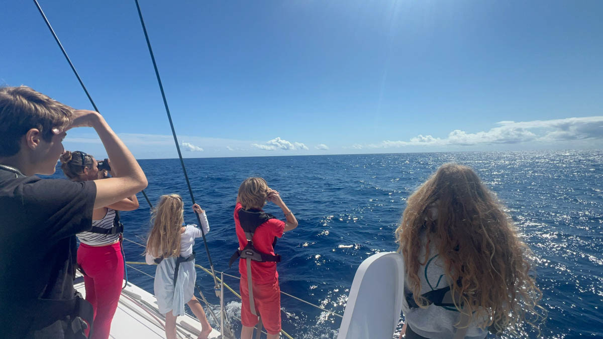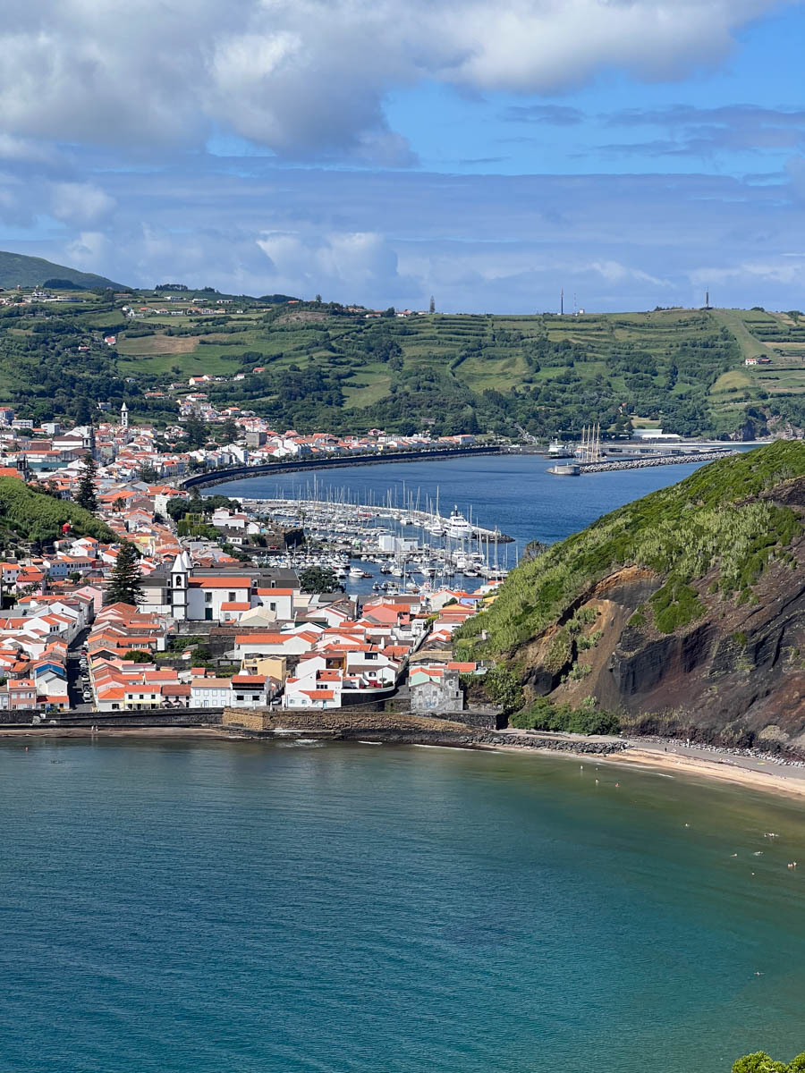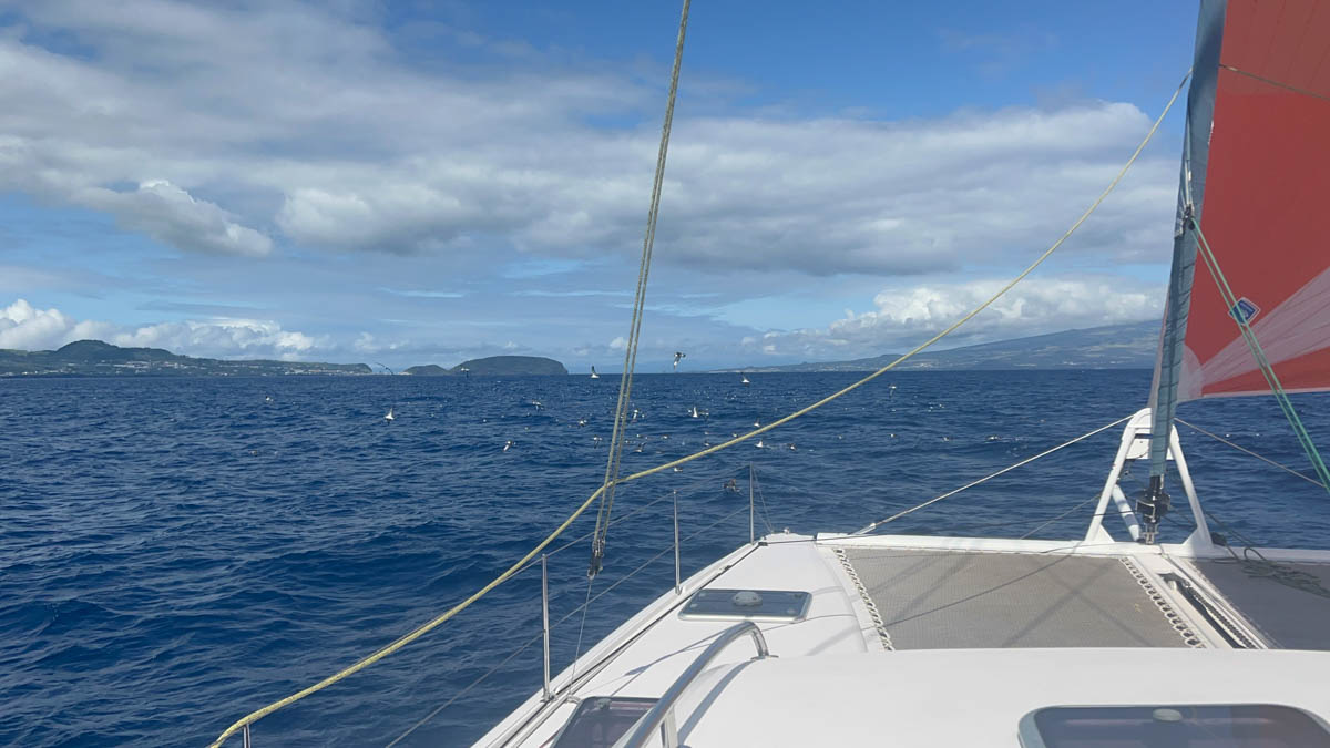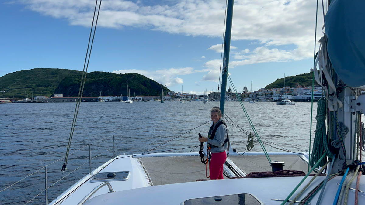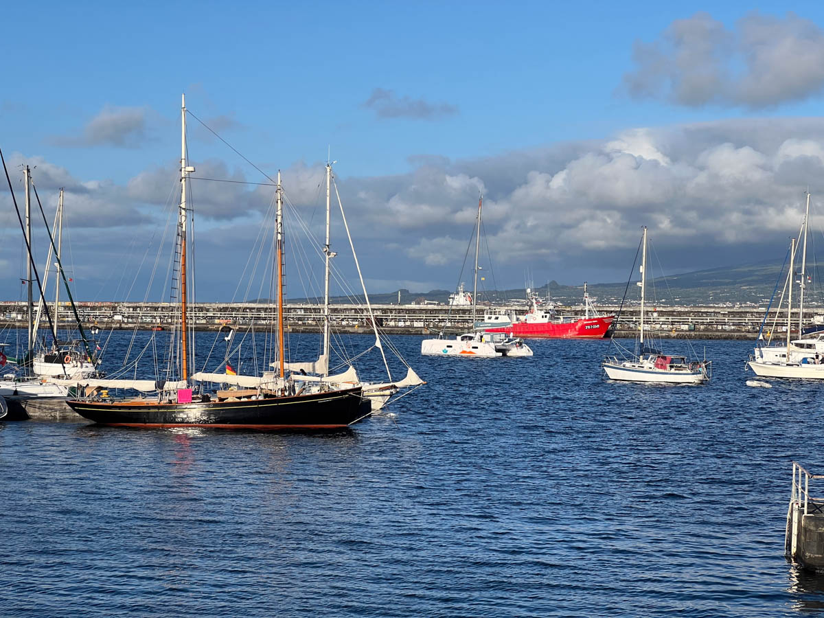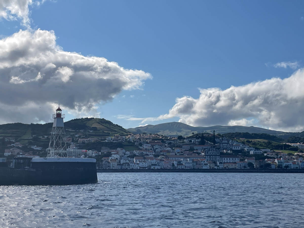 Jeudi 17 juillet après-midi nous sommes tout proche de l’île de Faial et nous voyons à l’AIS des rassemblements de bateaux. Nous supposons que ce sont des excursions pour voir des baleines. Nous arrondissons nos bords pour les rejoindre et car nous espérerons apercevoir ces mammifères marins. Magali chausse les jumelles et s’installe dehors. Après une heure de veille nous apercevons quelques geysers : ce sont des souffles de baleines ! Nous de verrons qu’un petit bout de leur dos mais nous sommes tout de même admiratifs devant le spectacle. Nous contournons l’île par le sud pour arriver dans le port d’Horta. Les façades blanches et noires nous accueillent sous un joli soleil. À la VHF le marinero nous indique que les catamarans doivent mouiller entre le port des cargos et la marina.