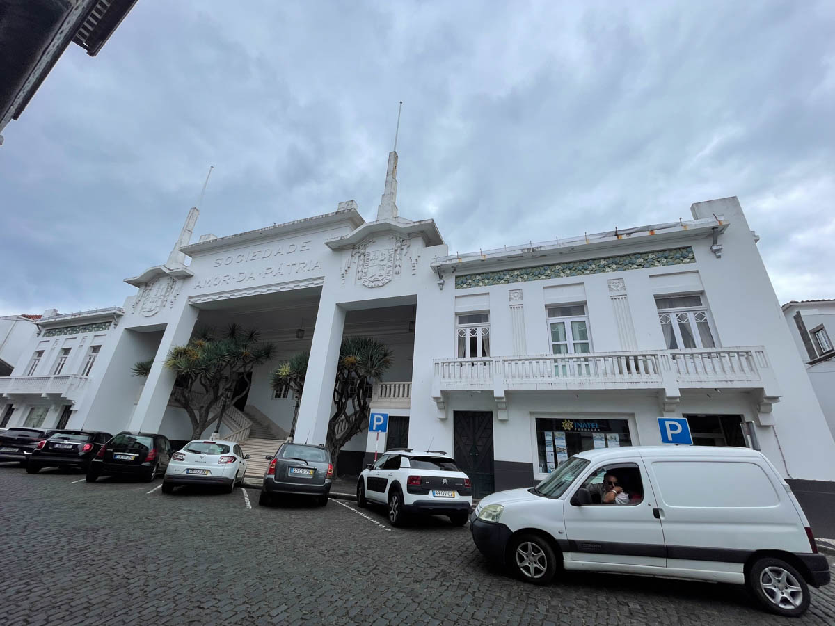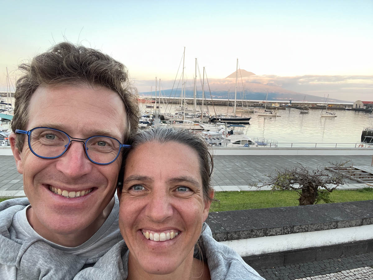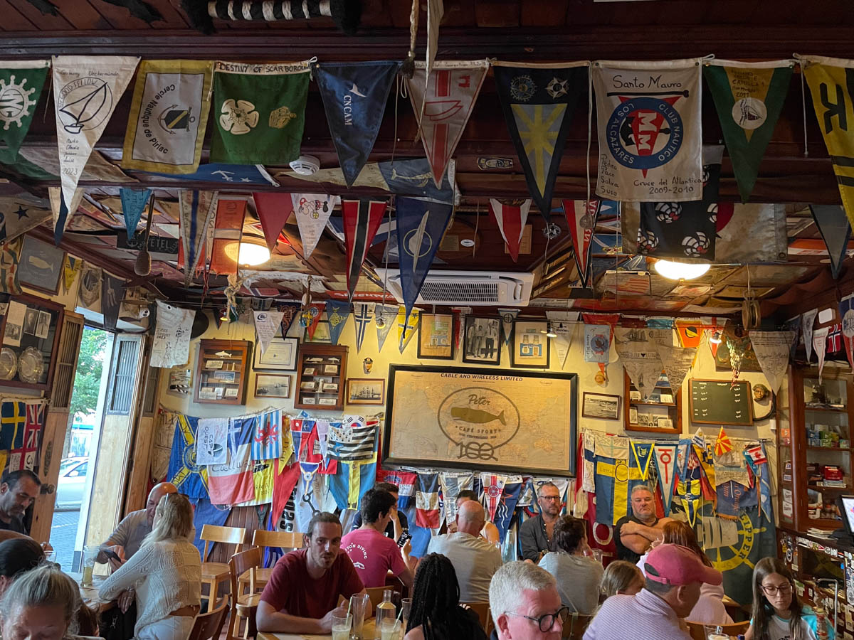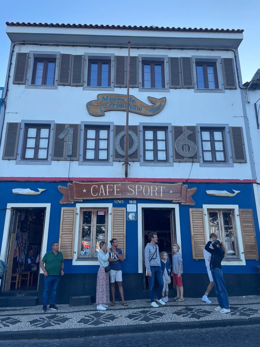 Nous rangeons rapidement le bateau et mettons l’annexe à l’eau pour aller fouler la terre ferme. Nous allons faire les formalités d’entrée en Europe et déambulons sur le quai principal recouvert de fresques de bateaux passés avant nous. Nous repérons les peintures des bateaux-copains Asja et Nomade. La marina nous propose une place à couple d’un gros voilier le long du quai nord. Nous sommes bien tenté d’être tranquille au port ces prochains jours. Nous irons déplacer le bateau après dîner. Car nous voulons tester le bar mythique d’Horta le Café Sport tenu par Peter depuis 3 générations. Le bar est décoré par les drapeaux de nombreux bateaux de passage. Nous dégustons la bonne viande de l’île sur la terrasse avec vue sur les bateaux et sur l’île Pico en face avec son grand volcan.