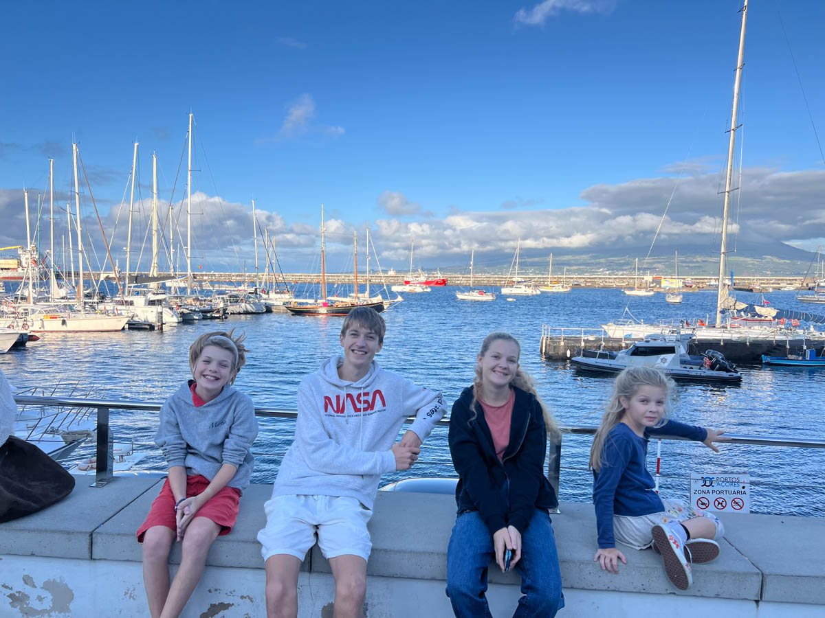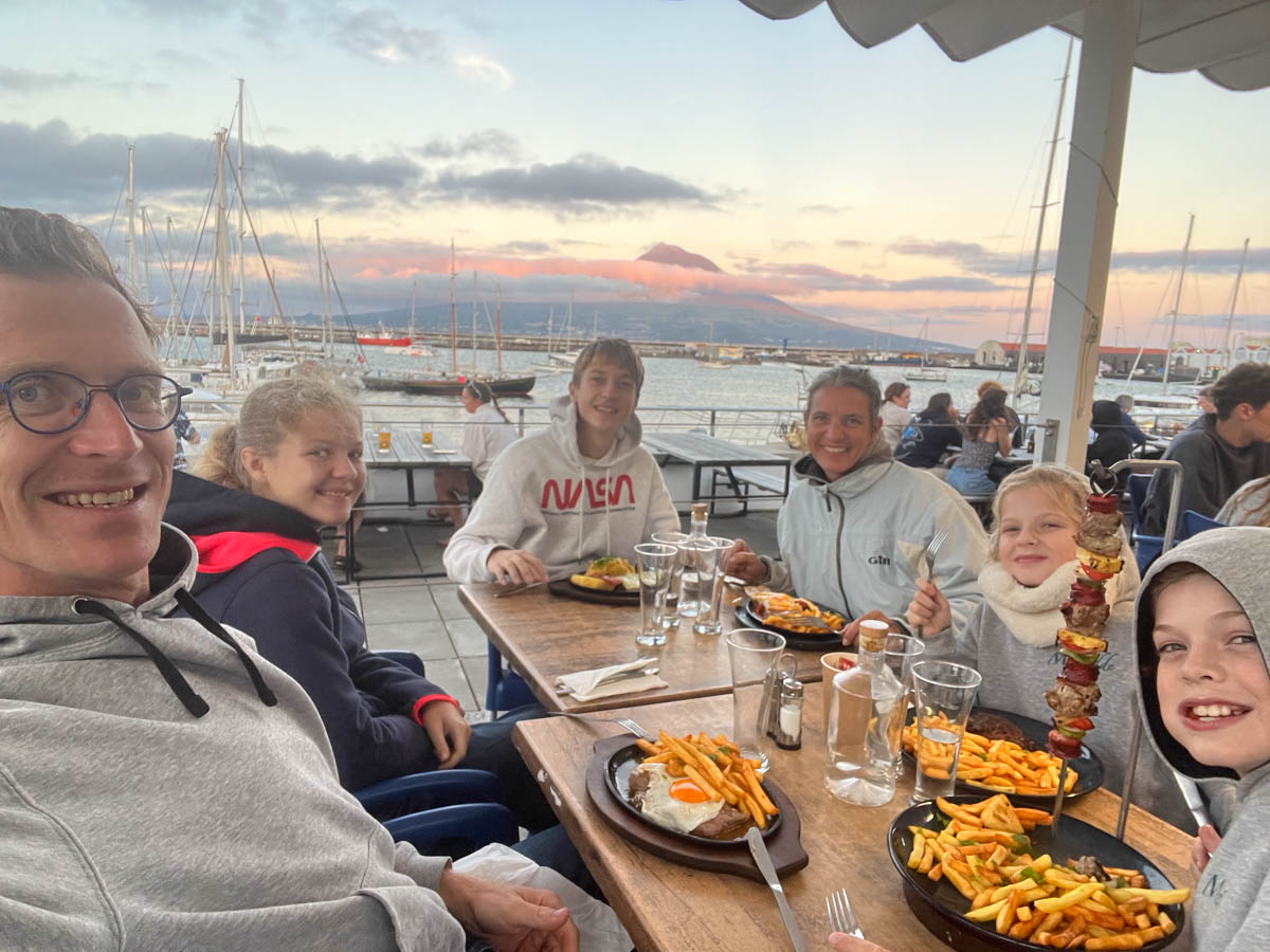 Pour notre dernier dîner à Horta nous allons chez Pizza Papa : nous commandons 6 pizza (on emportera la moitié pour demain soir) délicieuse, copieuse et très bon marché (12€ par pizza). Les parents vont prendre un dernier verre chez Peter au coucher du soleil. Il nous faut du courage pour reprendre la mer au vu des conditions qui nous attendent !