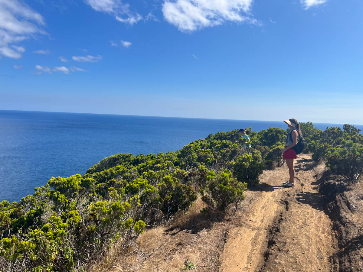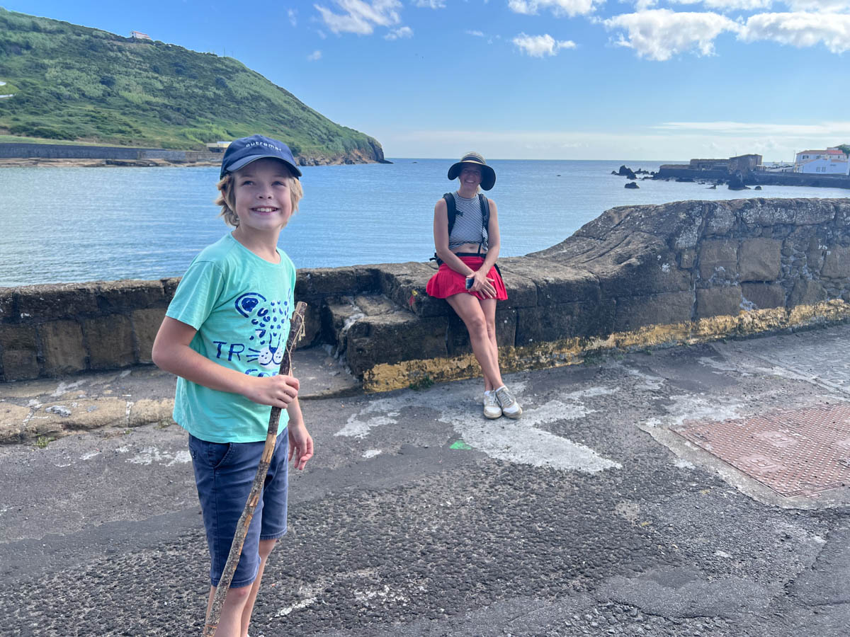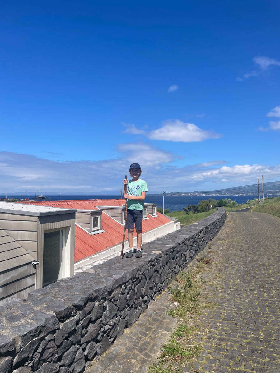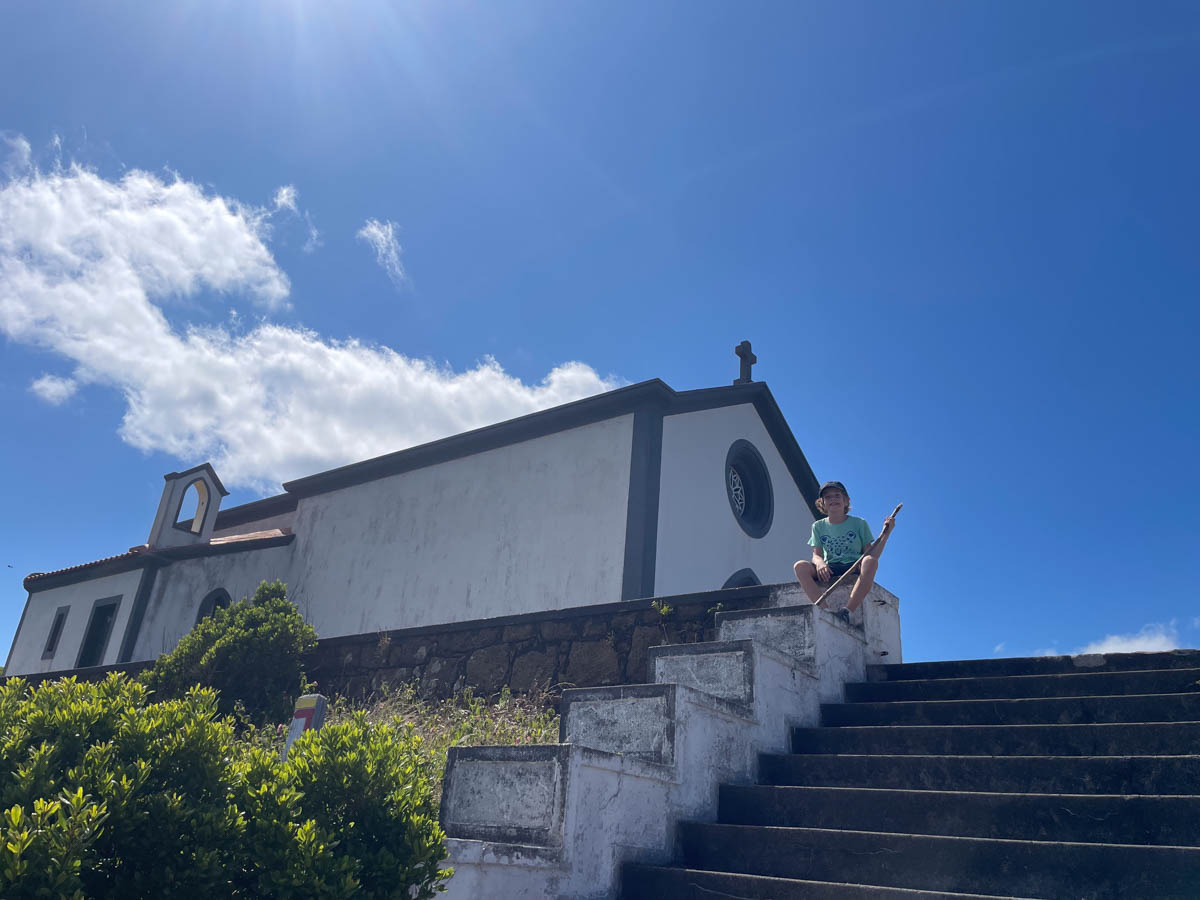 En haut de la montée une chapelle blanche et noir marque le point culminant du sentier. Devant nous s’ouvre le cratère de l’ancien volcan Guia. Nous le longeons, faisons une petite pause goûter et redescendons dans les hautes herbes le long de la mer. Nous finissons la balade en marchant le long de la plage de Porto Pim. Nous rentrons au port par les petites rues et nous arrêtons pour une glace bien méritée chez Gelados do Atlantico qui fait des glaces artisanales et n’a plus beaucoup de variété le soir (pourtant nous sommes samedi en fin d’après-midi !)