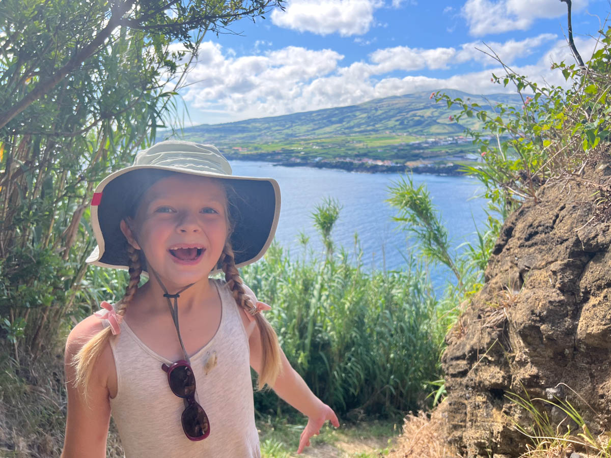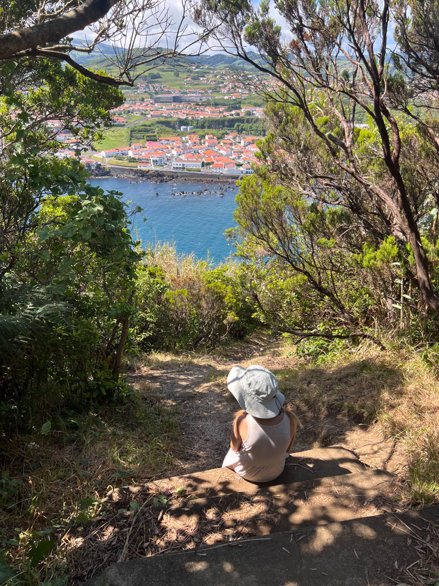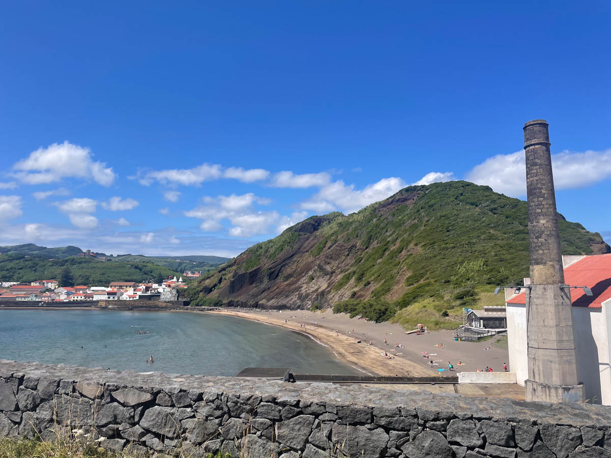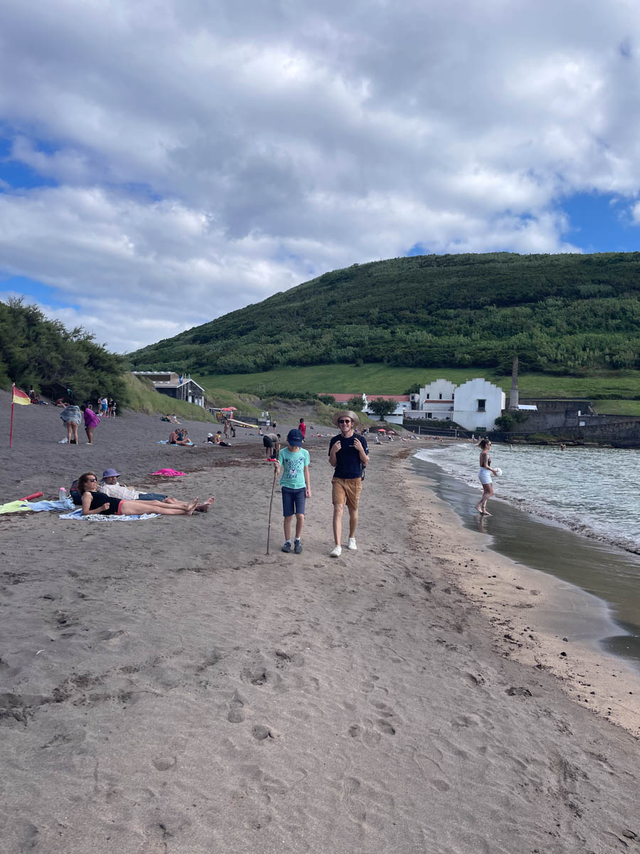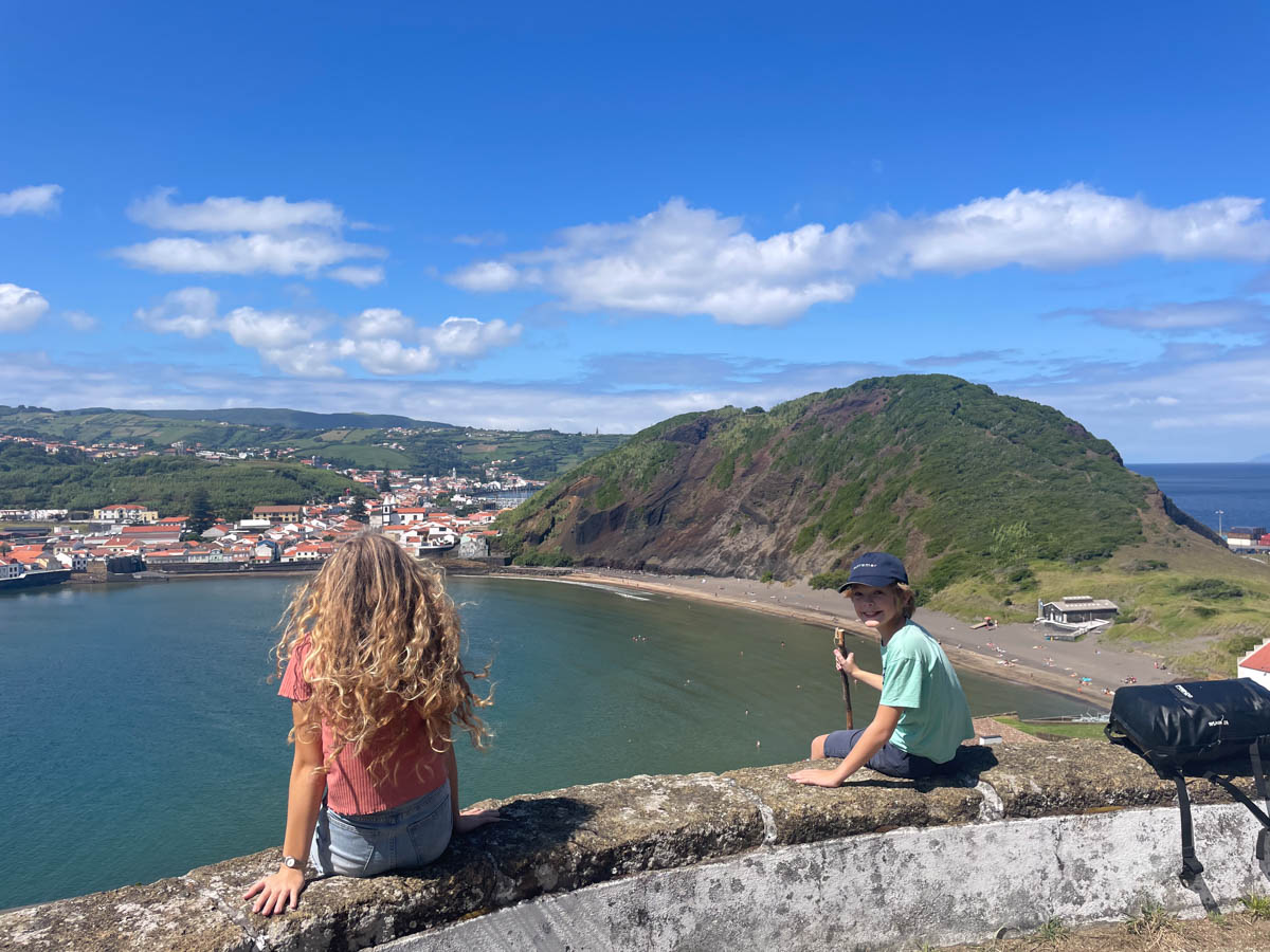 En haut de la montée une chapelle blanche et noir marque le point culminant du sentier. Devant nous s’ouvre le cratère de l’ancien volcan Guia. Nous le longeons, faisons une petite pause goûter et redescendons dans les hautes herbes le long de la mer. Nous finissons la balade en marchant le long de la plage de Porto Pim. Nous rentrons au port par les petites rues et nous arrêtons pour une glace bien méritée chez Gelados do Atlantico qui fait des glaces artisanales et n’a plus beaucoup de variété le soir (pourtant nous sommes samedi en fin d’après-midi !)