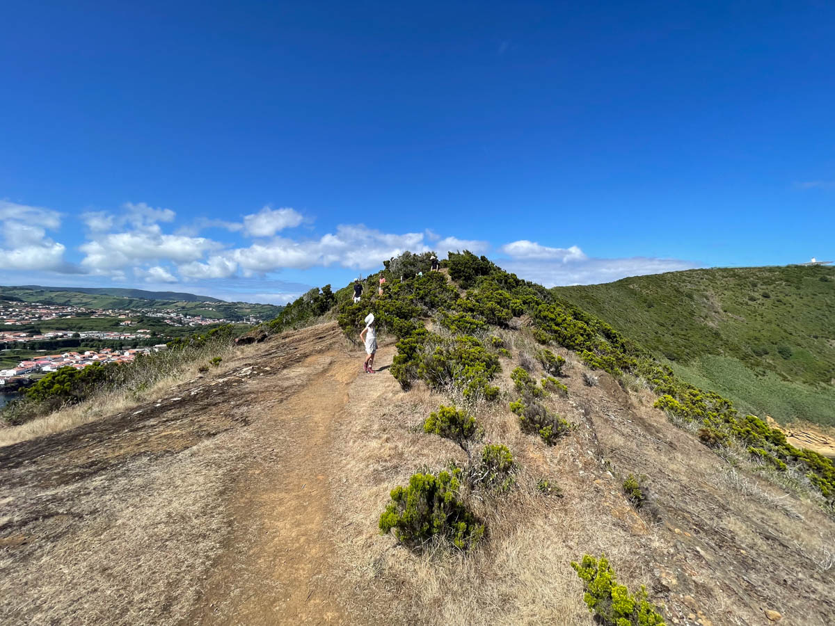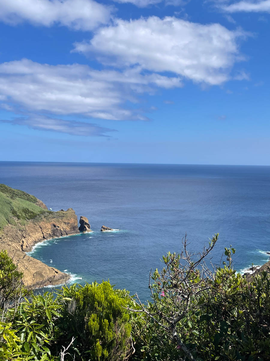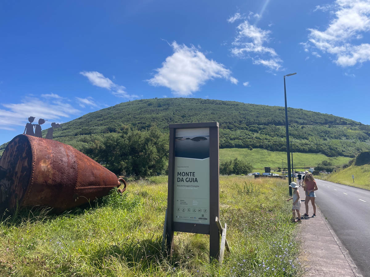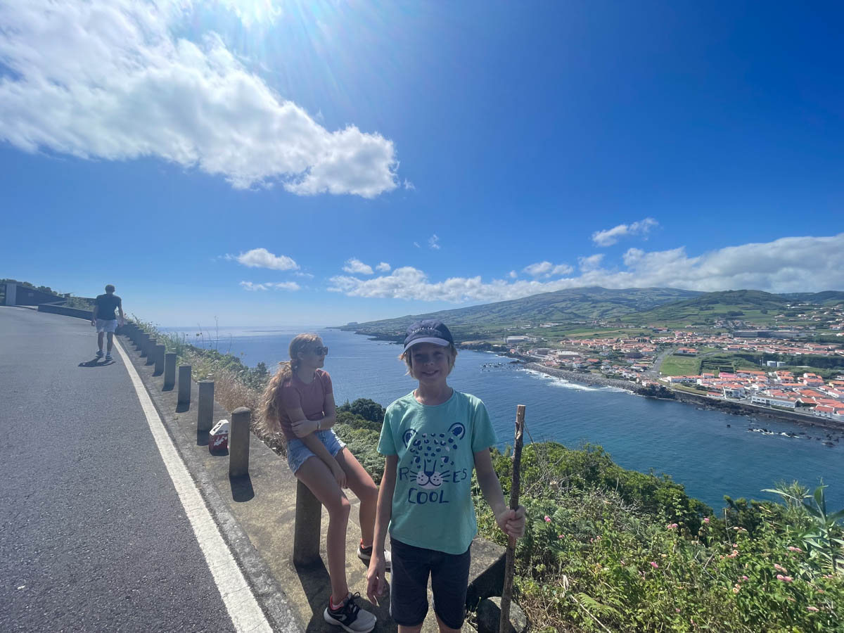 En haut de la montée une chapelle blanche et noir marque le point culminant du sentier. Devant nous s’ouvre le cratère de l’ancien volcan Guia. Nous le longeons, faisons une petite pause goûter et redescendons dans les hautes herbes le long de la mer. Nous finissons la balade en marchant le long de la plage de Porto Pim. Nous rentrons au port par les petites rues et nous arrêtons pour une glace bien méritée chez Gelados do Atlantico qui fait des glaces artisanales et n’a plus beaucoup de variété le soir (pourtant nous sommes samedi en fin d’après-midi !)