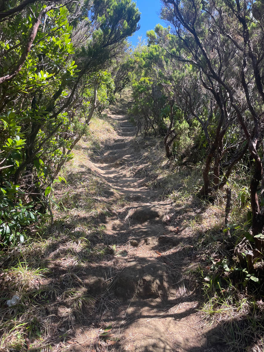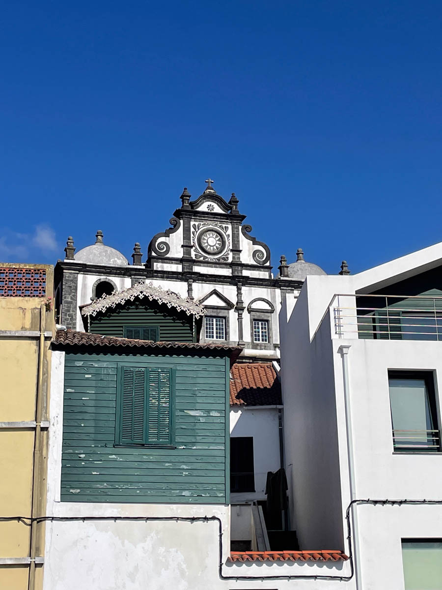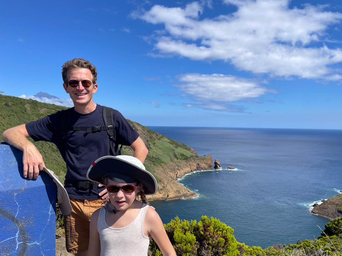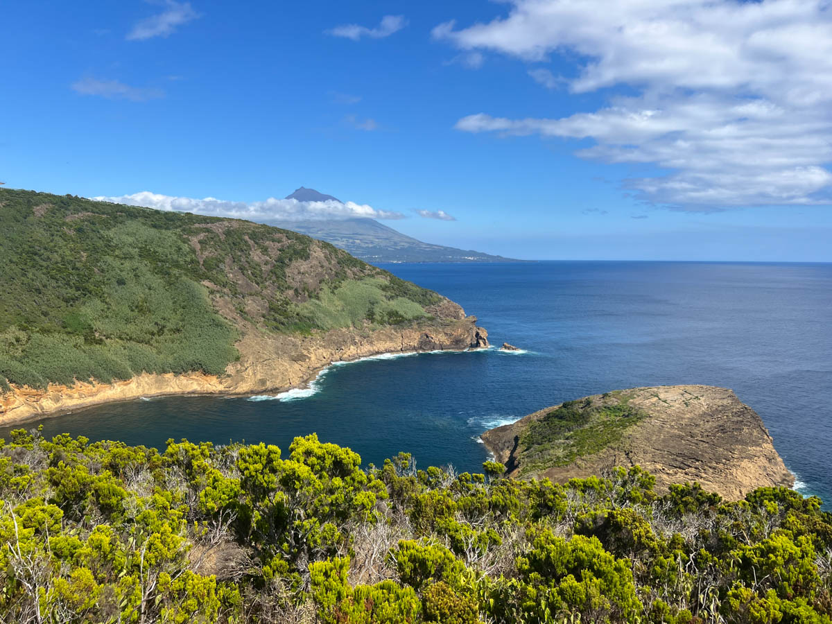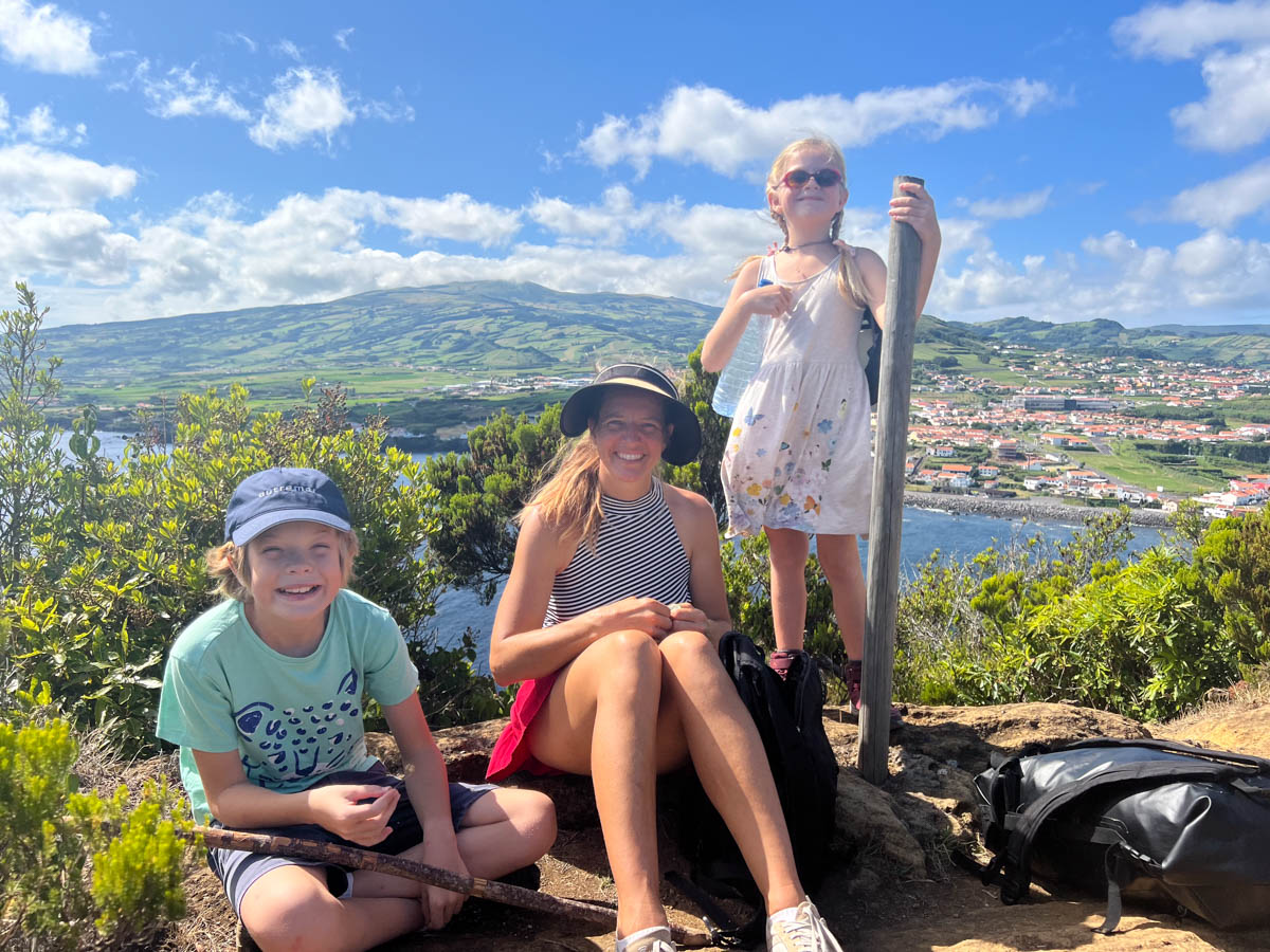 En haut de la montée une chapelle blanche et noir marque le point culminant du sentier. Devant nous s’ouvre le cratère de l’ancien volcan Guia. Nous le longeons, faisons une petite pause goûter et redescendons dans les hautes herbes le long de la mer. Nous finissons la balade en marchant le long de la plage de Porto Pim. Nous rentrons au port par les petites rues et nous arrêtons pour une glace bien méritée chez Gelados do Atlantico qui fait des glaces artisanales et n’a plus beaucoup de variété le soir (pourtant nous sommes samedi en fin d’après-midi !)