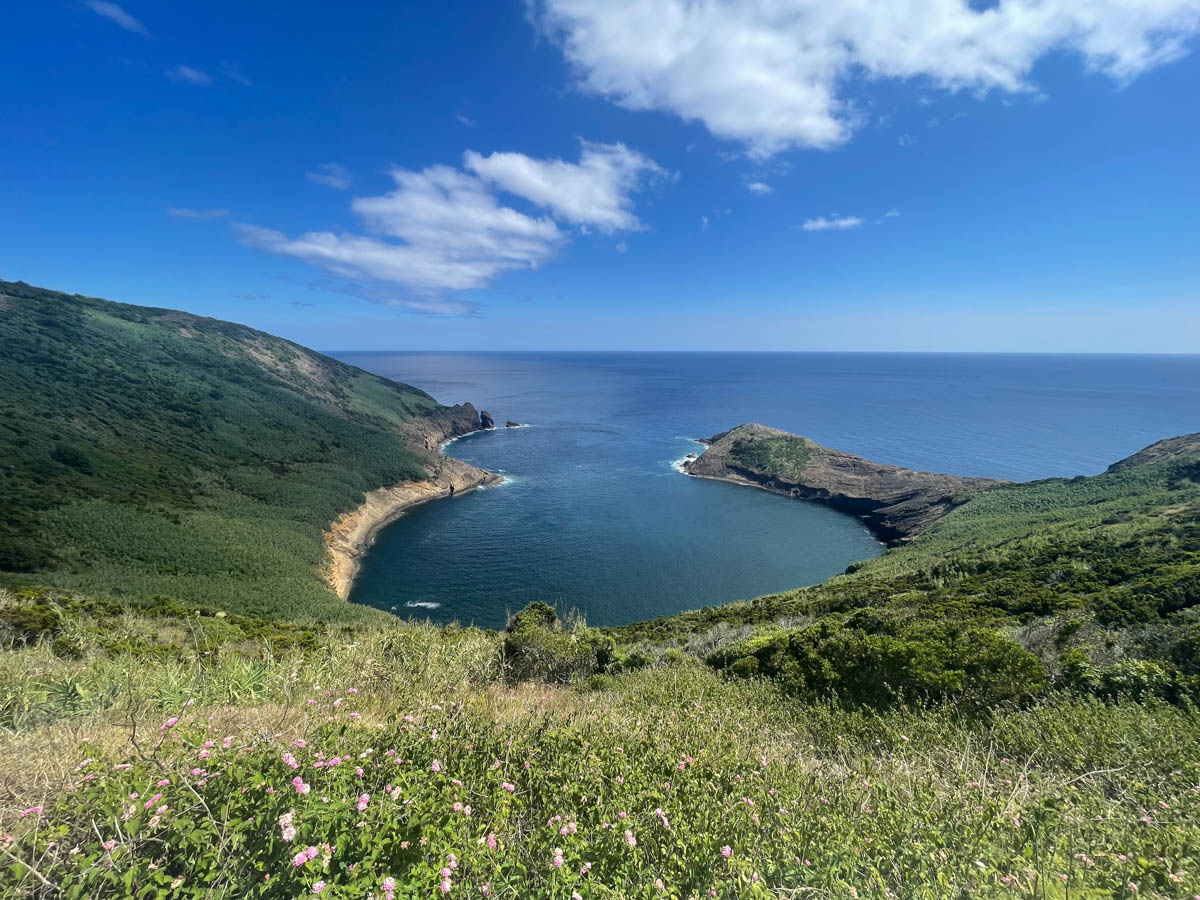 Samedi 19 juillet dans l’après-midi nous allons randonner sur le volcan de Monte Da Guia au sud de Horta. Nous longeons le port puis la route jusqu’à l’ancien usine de transformation de la pêche à la baleine. Nous prenons un petit sentier qui grimpe à flanc de montagne. Parfois se sont même des escaliers que nous devons gravir sous les petits arbres. Mais les vues sur la ville d’Horta, la plage de Porto Pim et la côte ouest de l’île valent le détour.