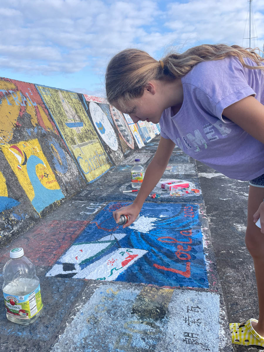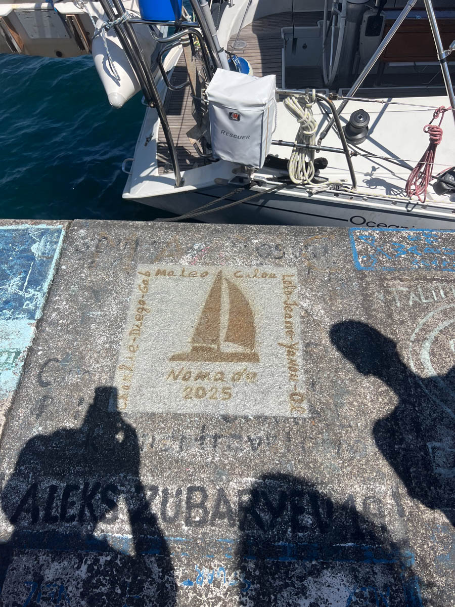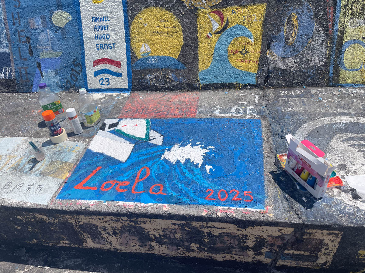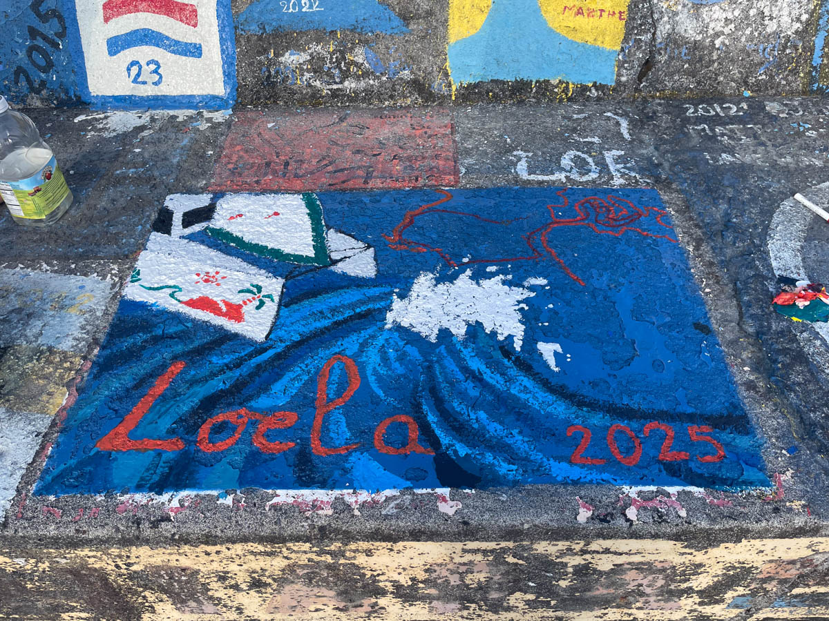 Pendant ce temps nous faisons tous la peinture de notre fresque. Le dessin est une idée originale d’Alice. Le nom du bateau et l’année sont peints par Alice, Mathilde et Magali, la vague par Alice, le bateau par Mathilde et Magali (avec l’aide de la peinture blanche d’un autre équipage), la décoration de coque par Alice, la carte et le parcours par Martin et Antoine. Nous sommes très fier de notre création !