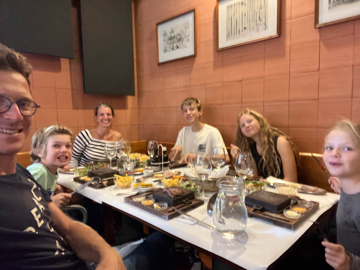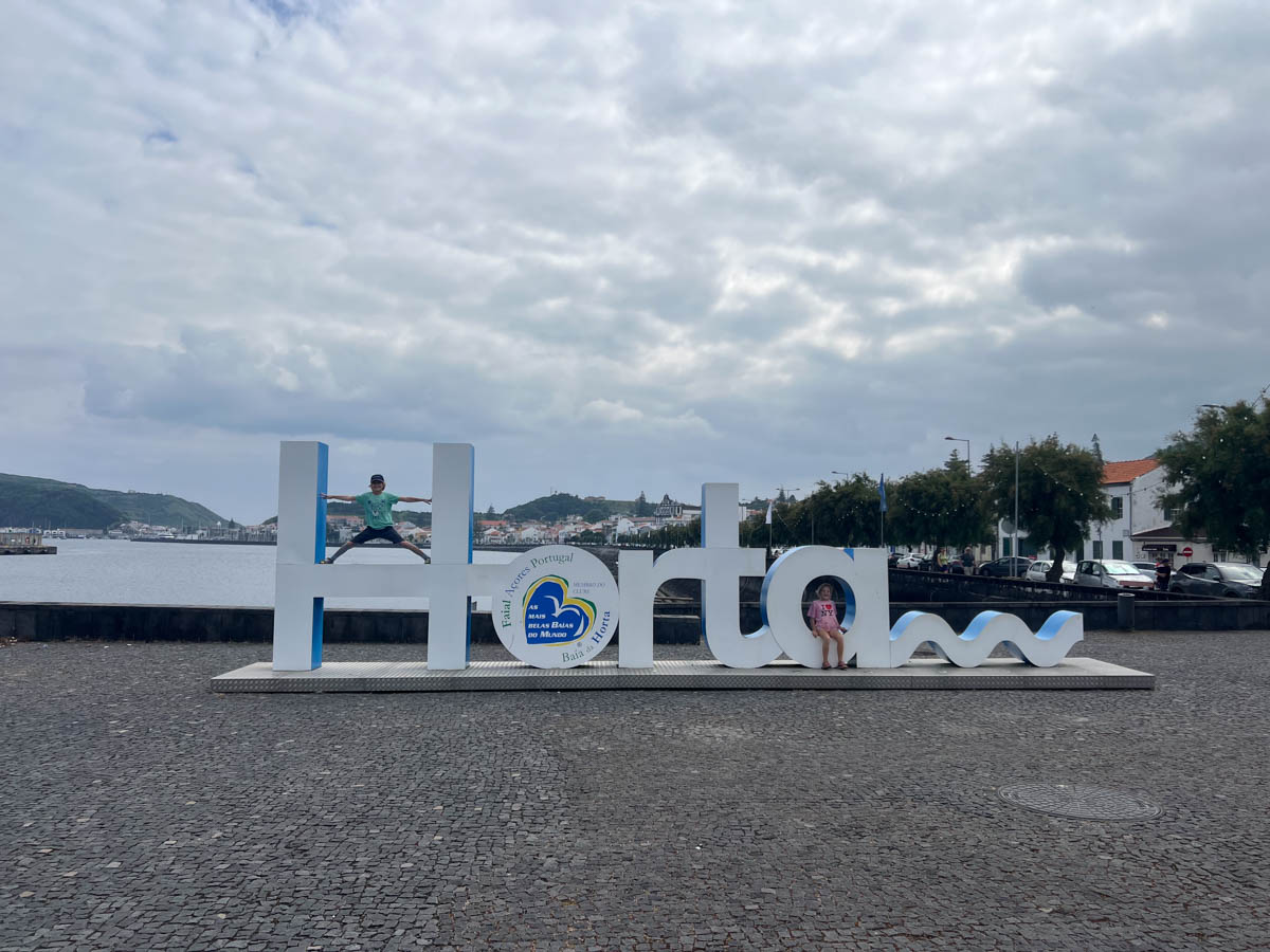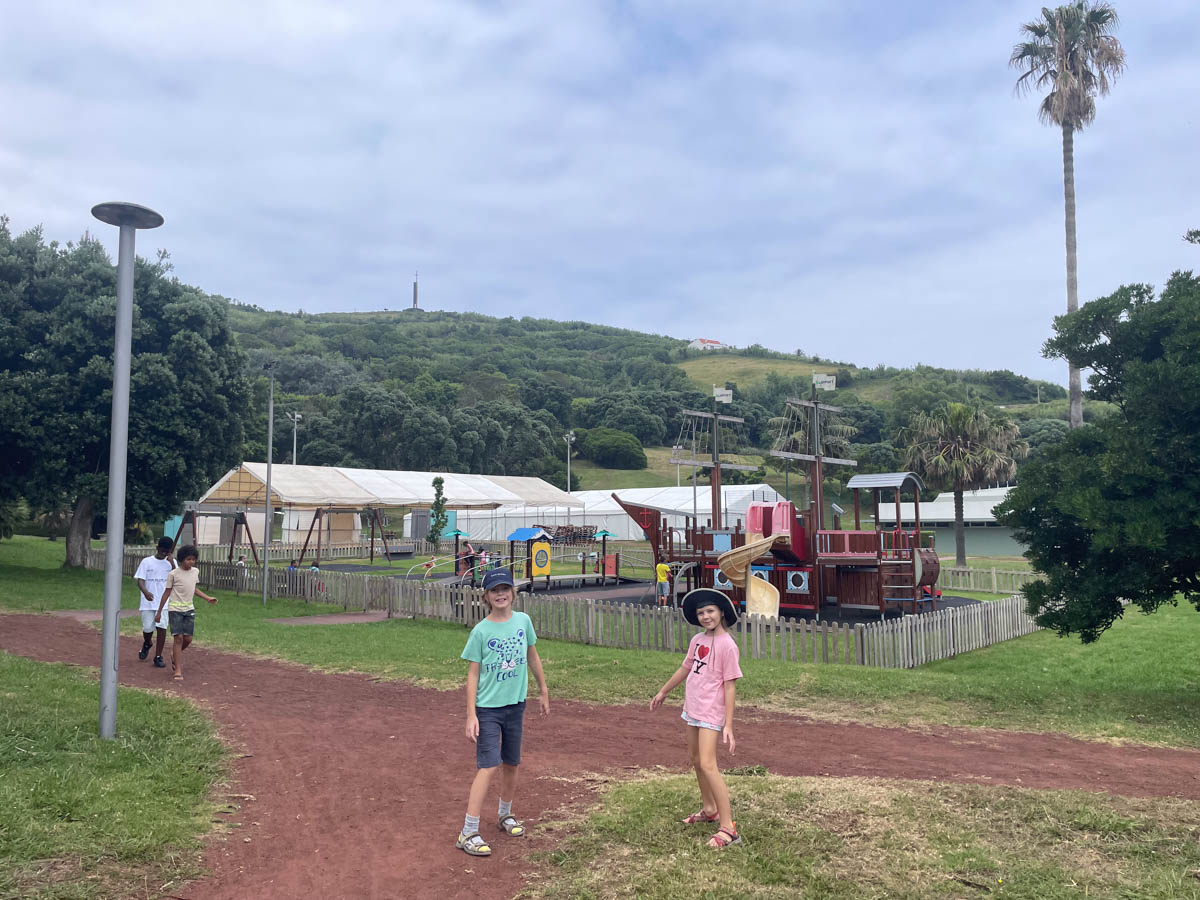 L’après-midi nous allons nous balader au nord d’Horta jusqu’au parc. Nous faisons un premier arrêt à la laverie pour une machine de coussins. Nous déambulons dans les petites rues pavées et bordées de maisons noires et blanches avec des balcons en ferronnerie. Nous passons devant le marché couvert (fermé le dimanche) et faisons une petite pause dans le square d’à côté. Un joli kiosque rouge trône au centre d’un mignon jardin. Nous continuons jusqu’après l’embarcadère des ferry, où un petit parc rassemble les familles autour d’une belle aire de jeux. C’est le dimanche des goûters d’anniversaire pour les habitants. Nous nous reposons dans l’herbe pendant que Martin et Mathilde grimpent dans le bateau pirate et redescendent les toboggans. La ville est tellement tranquille que nous laissons Martin et Mathilde rentrer seuls au bateau (un autre avantage du port) pendant que les parents vont récupérer la lessive. Il est déjà l’heure de se préparer pour aller au restaurant que nous avons réservé. Nous sommes sûrs que le menu plaira à tous : grillades de viande et poisson sur pierre chaude 😋.