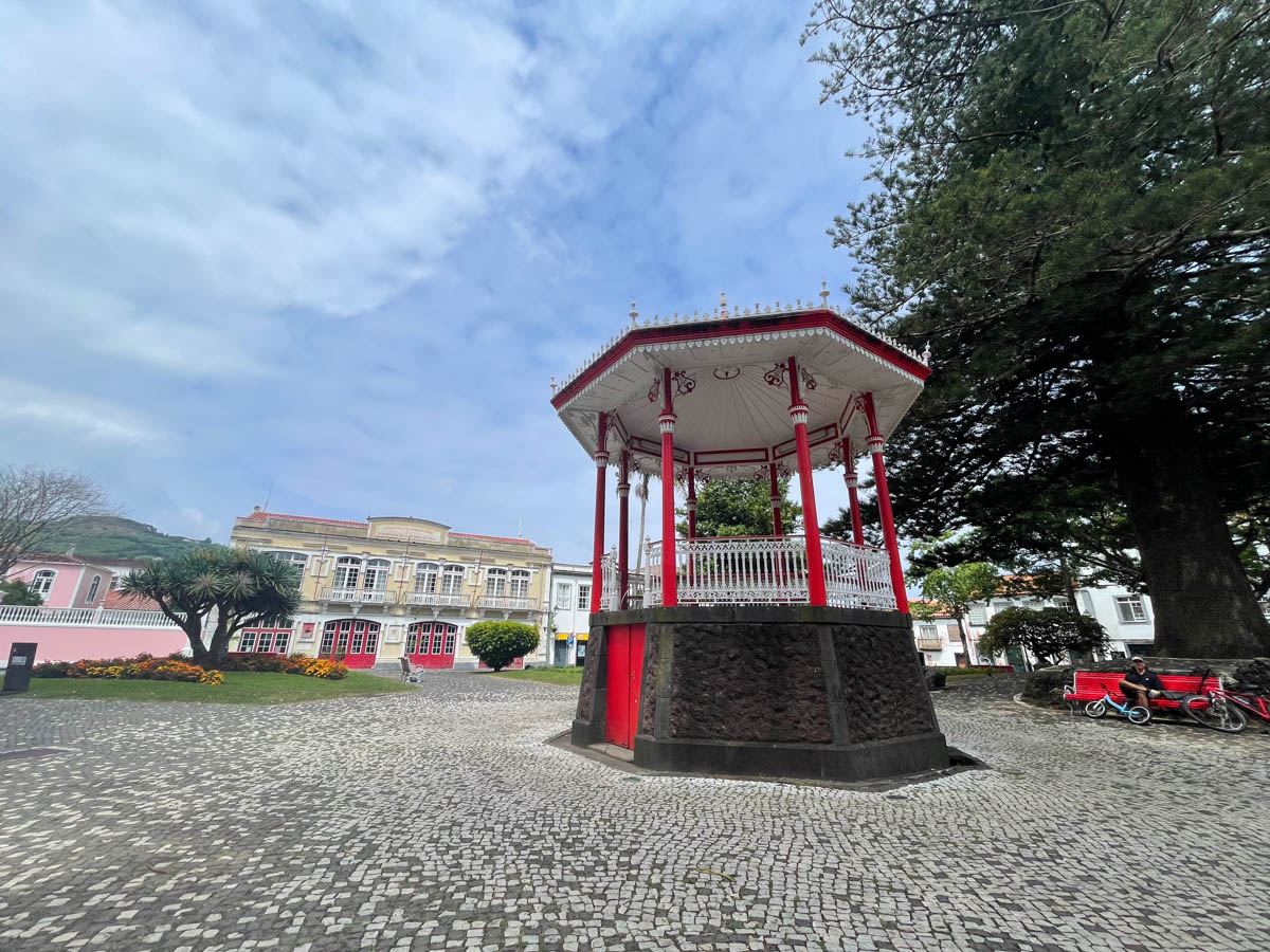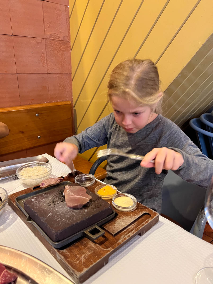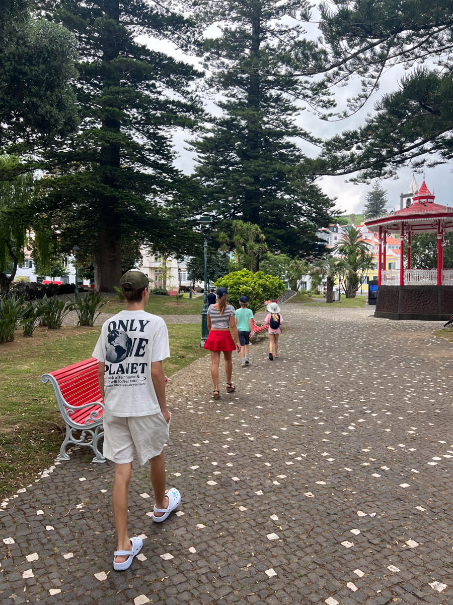 L’après-midi nous allons nous balader au nord d’Horta jusqu’au parc. Nous faisons un premier arrêt à la laverie pour une machine de coussins. Nous déambulons dans les petites rues pavées et bordées de maisons noires et blanches avec des balcons en ferronnerie. Nous passons devant le marché couvert (fermé le dimanche) et faisons une petite pause dans le square d’à côté. Un joli kiosque rouge trône au centre d’un mignon jardin. Nous continuons jusqu’après l’embarcadère des ferry, où un petit parc rassemble les familles autour d’une belle aire de jeux. C’est le dimanche des goûters d’anniversaire pour les habitants. Nous nous reposons dans l’herbe pendant que Martin et Mathilde grimpent dans le bateau pirate et redescendent les toboggans. La ville est tellement tranquille que nous laissons Martin et Mathilde rentrer seuls au bateau (un autre avantage du port) pendant que les parents vont récupérer la lessive. Il est déjà l’heure de se préparer pour aller au restaurant que nous avons réservé. Nous sommes sûrs que le menu plaira à tous : grillades de viande et poisson sur pierre chaude 😋.