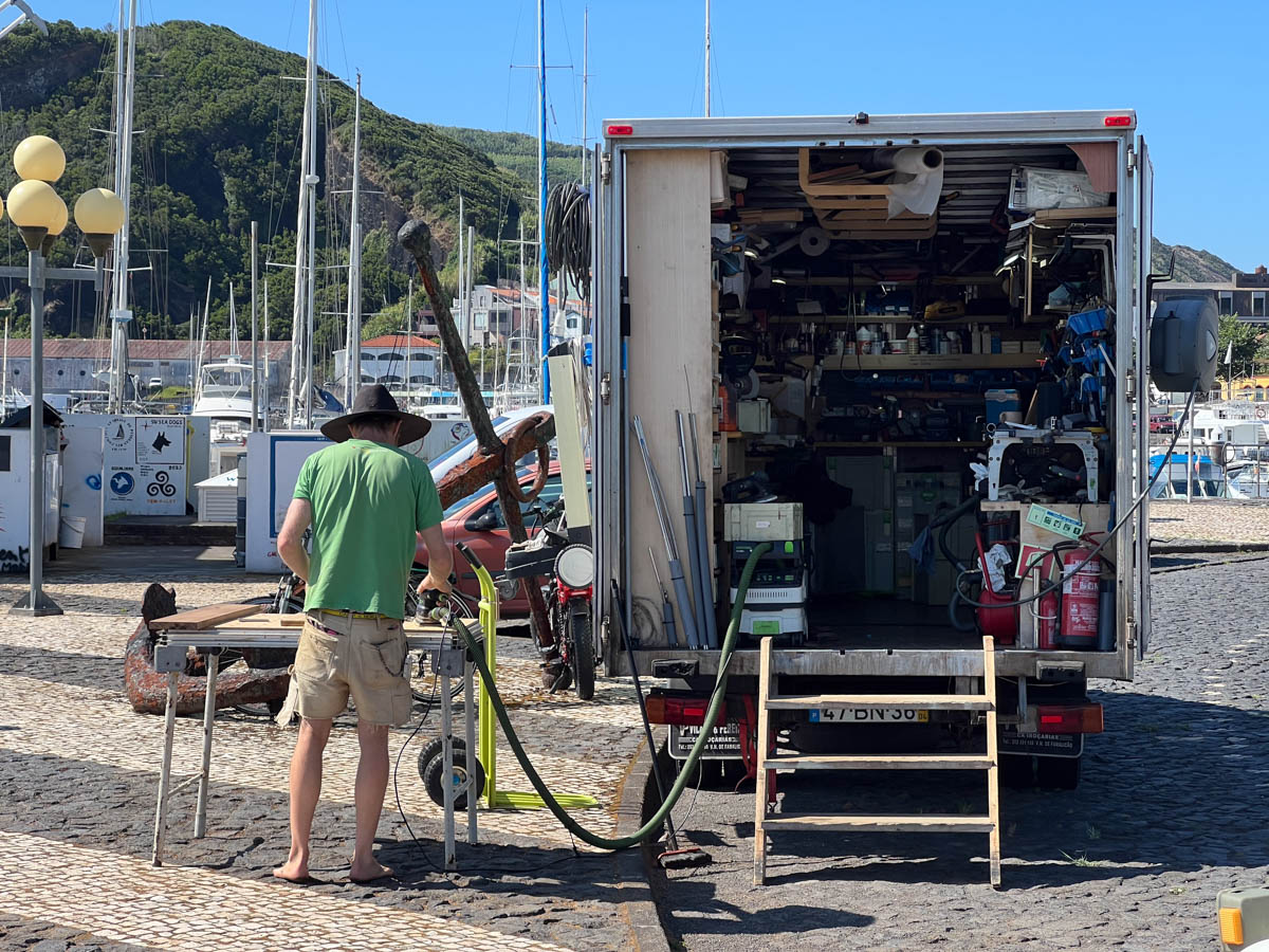 En faisant un contrôle du pilote automatique Antoine coince l’écrou au milieu du boulon. Catastrophe ! Le pilote est un vérin hydraulique qui pousse ou tire sur le safran en fonction des paramètres que nous lui donnons. En cas de blocage du pilote Antoine voulait avoir la possibilité de déconnecter le vérin du safran. Malheureusement la boule de connexion s’est complètement grippée sur le boulon de fixation au safran. Antoine essaye alors de dévisser l’écrou du boulon de fixation pour pouvoir désolidariser le pilote. Et c’est là que de manière incompréhensible l’écrou s’est complètement coincé. Il est trop tard en France pour demander conseil à Outremer. Mais nous ne pouvons pas naviguer en l’état. Malgré tout nous trouvons l’origine du bruit du pilote automatique que nous avions depuis deux semaines : juste l’autre fixation du pilote qui bougeait un petit peu sur son support. Antoine arrive à le revisser sans problème.
